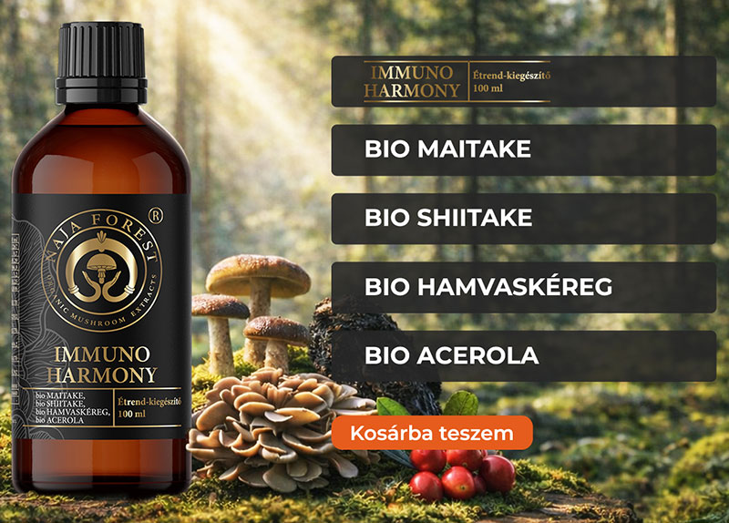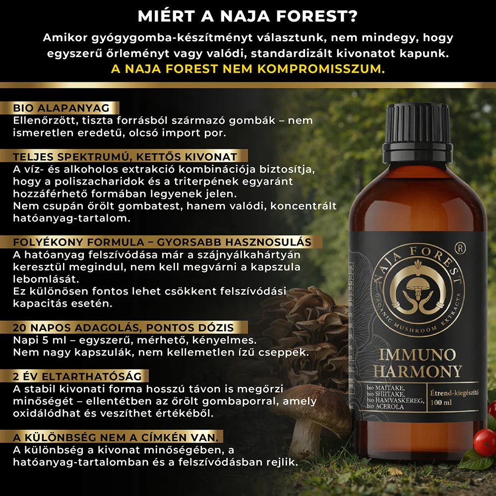 Egy üveg Naja Forest Immuno Harmony a kettős extrakciós eljárásnak köszönhetően a Maitake gomba, a Shiitake gomba és a Hamvaskéreg gomba teljes hatóanyag tartalmát tartalmazza, a glicerines formula pedig biztosítja a hatóanyagok szinte 100 %-os felszívódását.